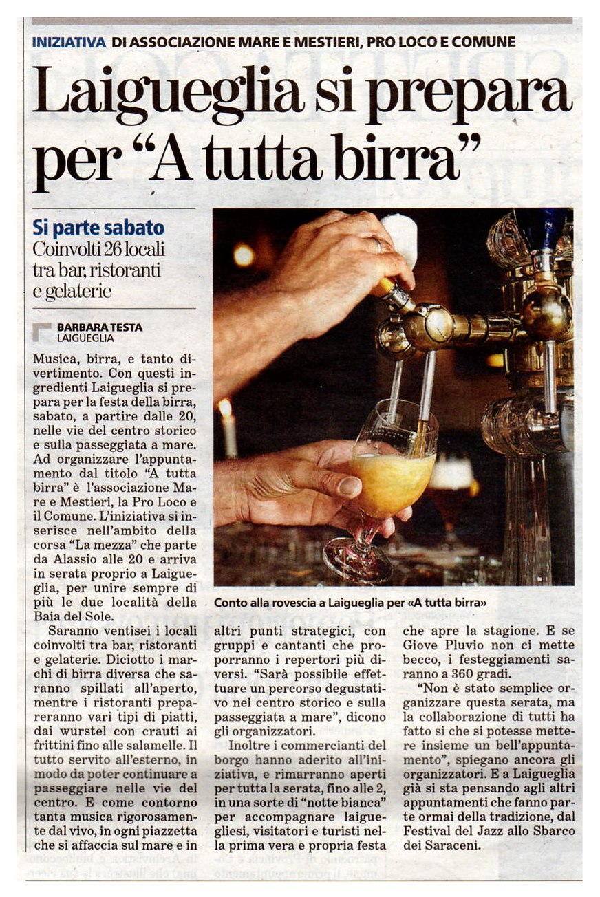 Da "La Stampa" del 08/05/2013, Ed. Savona, Spettacoli Savona, pagina 60. Laigueglia si prepara per "A tutta birra" Si parte sabato. Coinvolti 26 locali tra bar, ristoranti e gelaterie |