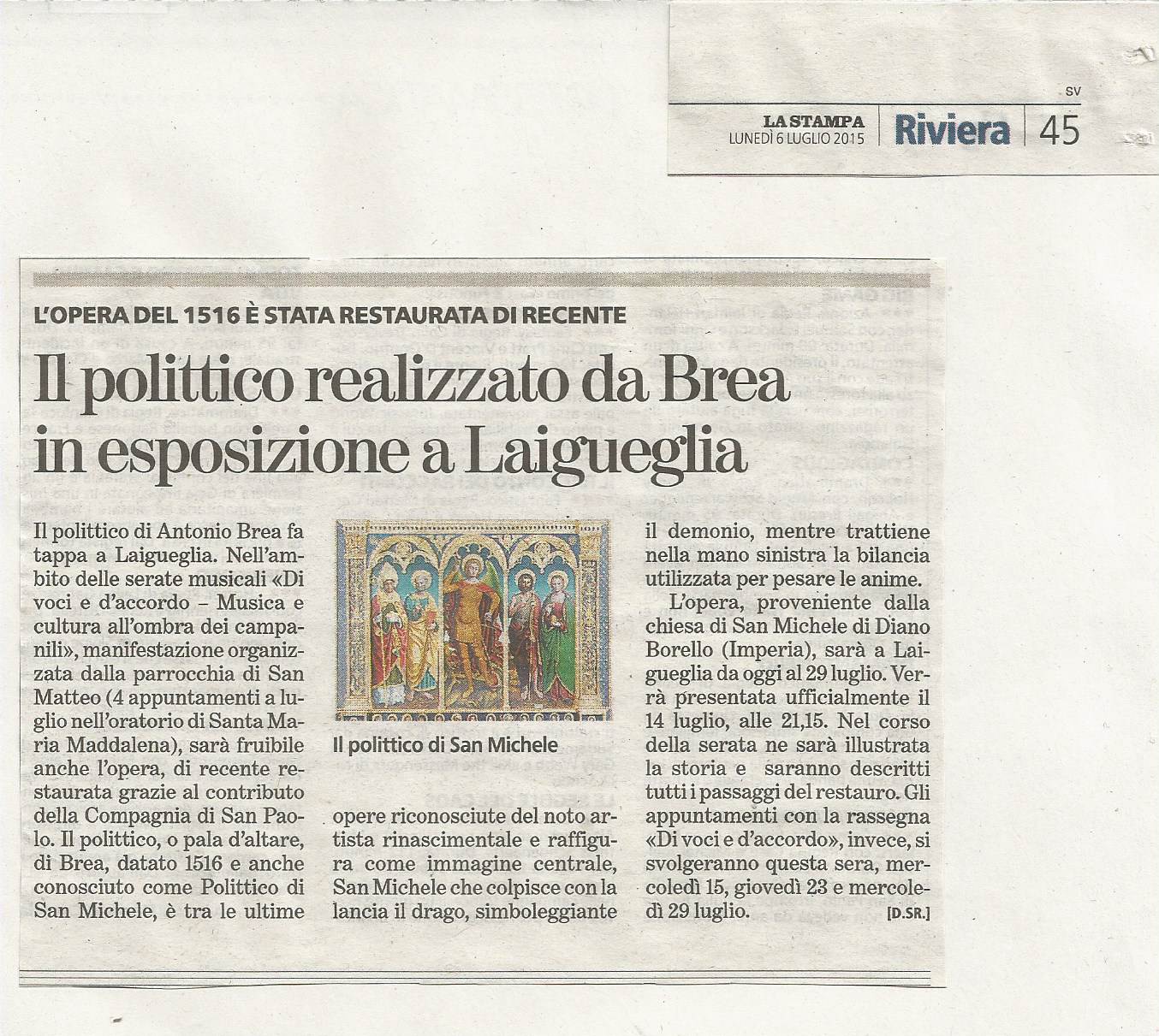 Da "La Stampa" del 06/07/2015, Ed. Savona, Riviera, pagina 45. Il polittico realizzato da Brea in esposizione a Laigueglia l'opera del 1516 è stata restaurata di recente |
